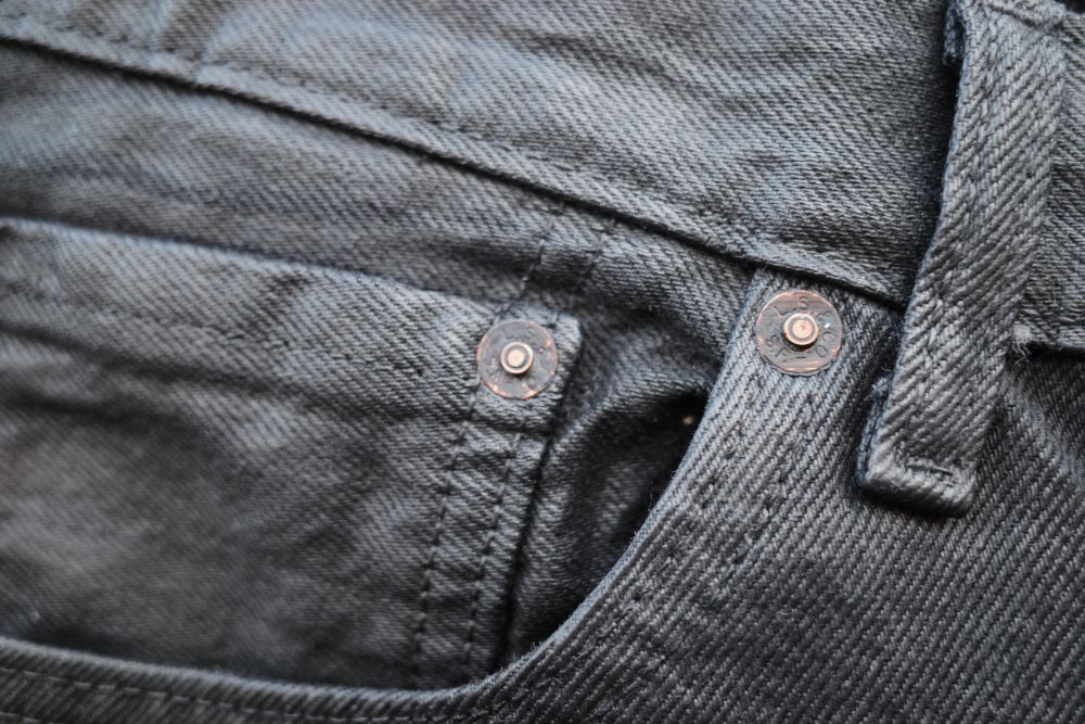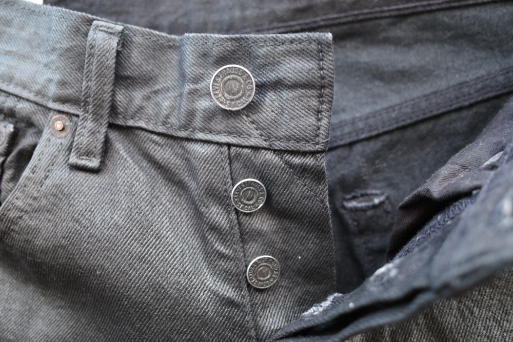 ボタンとリベットは黒いオイルがこびりついたような加工がなされており、細かいこだわりがgood。