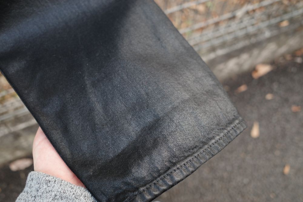 レザーパンツを思わせるようであるが、表面にデニム特有の織り綾、シワ、デコボコ感が見えることで過度なギラつきが抑えられている。けれども内に秘める反骨心は忘れない、ちょうどいい具合に仕上がった生地である。